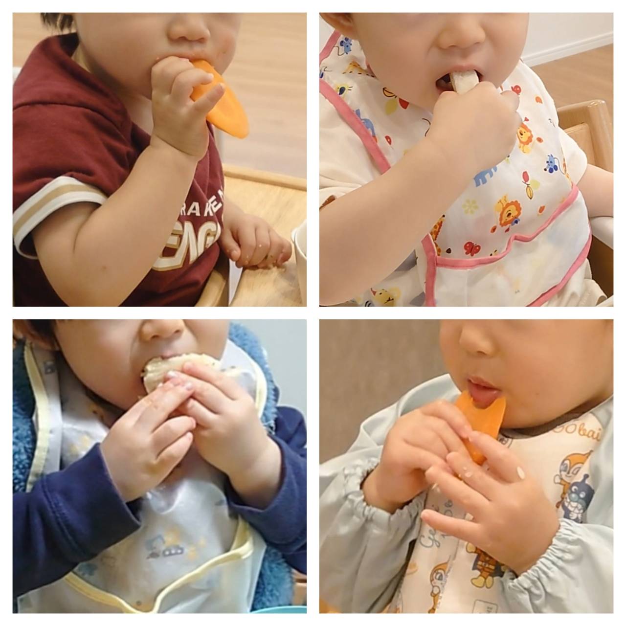 『前歯でかじり取る』ことは、単に食べ物を小さくするだけではありません。前歯でかじり取ることで唇を閉じる力が育ち、かじり取った食べ物は舌を上手く使いながら奥歯の方へ運び、モグモグとすりつぶす動作につながります。こうして、咀嚼の土台が作られていきます。