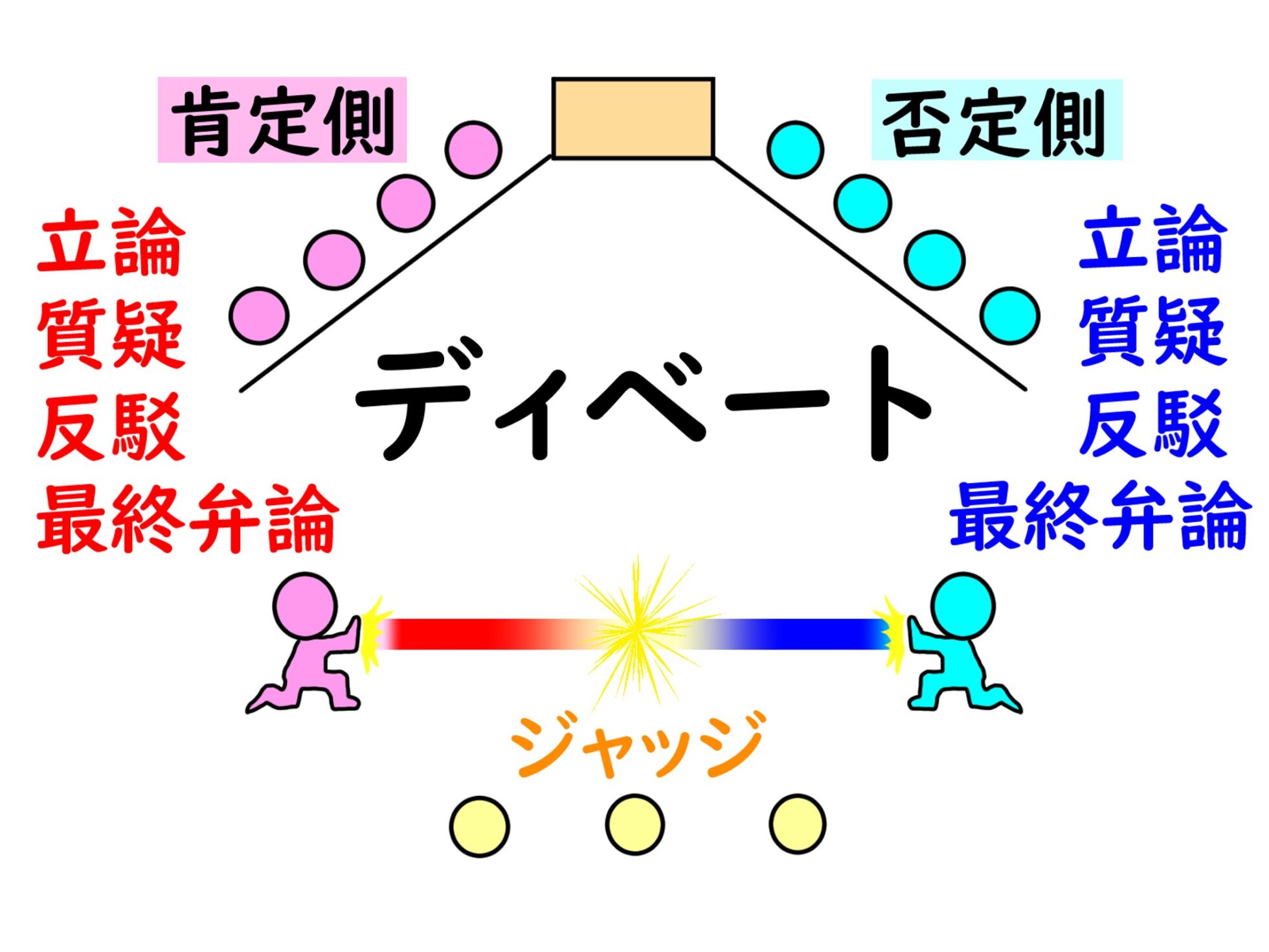 大学の授業で行うディベートは、あくまでも一定のルールに則った「ゲーム」です。2つのチームが与えられた論題に対して肯定側と否定側に分かれ、「立論」→「反駁」→「結論」を述べ、その勝敗を競います。ここで大切なのは、「自分の信条とは関係なく、討論の能力そのものが問われる」という点です。肯定側・否定側のどちらになるかはランダムに決められます。