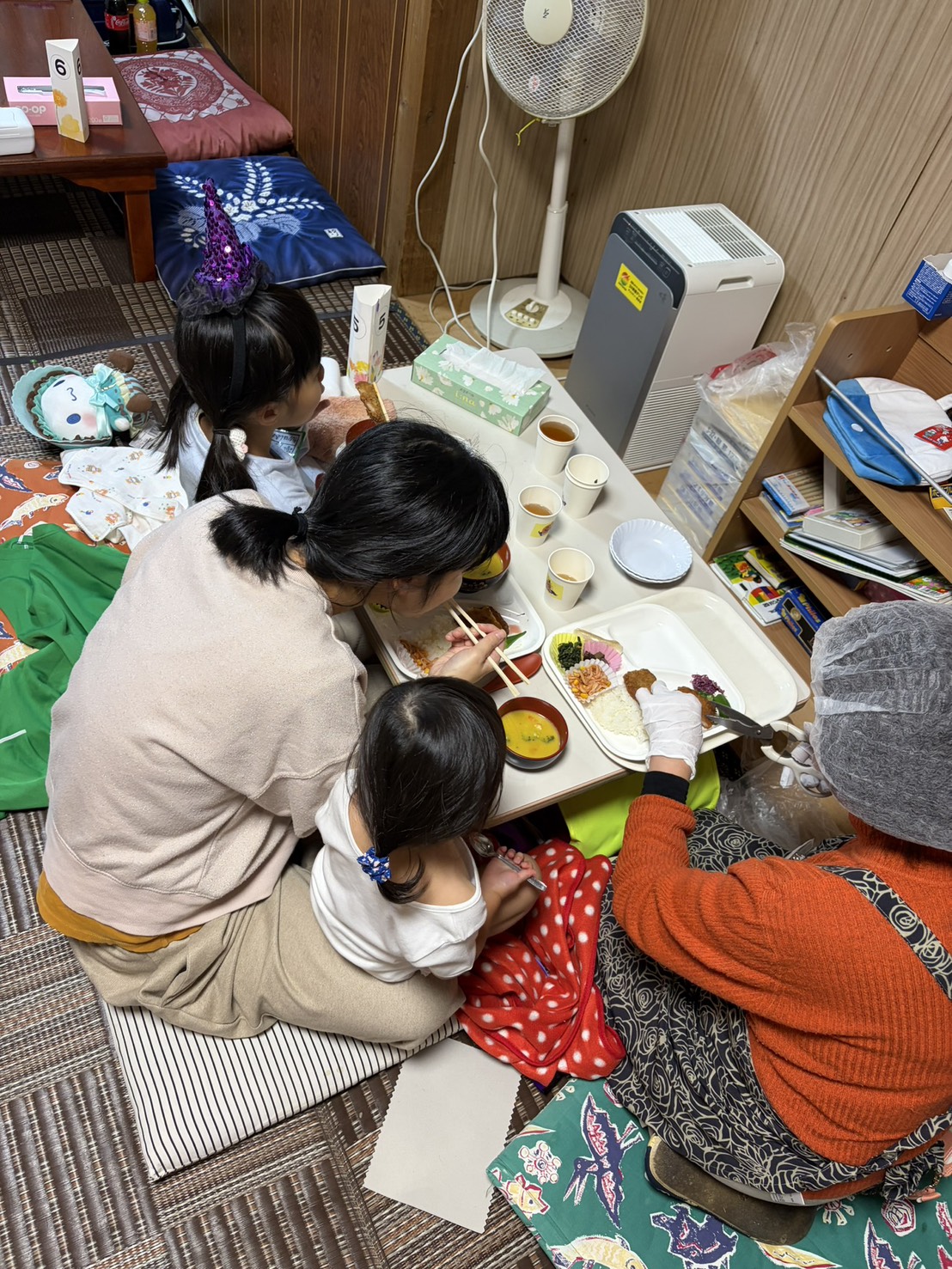 ご飯を運んでいくと子どもたちの「いただきます!」の声が響きます。それでも帰り際、お母さんたちは言います「今日はゆっくり食べられました。」核家族が増えているので、家でサポートしてくれる大人がいない家庭も少なくありません。でも、子ども食堂では、大きい子たちは食べ終わると、そこにいる子どもたちとすぐに遊び始めます。赤ちゃんがぐずるとボランティアさんが自然に抱っこします。離乳食の時期の子どもには、親の隣でそっと支援に入ります。だから、ここで少し肩の力を抜けるのかもしれません。